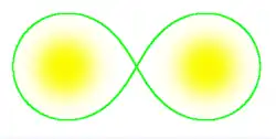Représentation en deux dimensions des lobes de Roche d'un système binaire. Le point de contact entre les deux lobes correspond à un point de Lagrange.