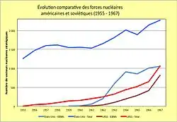 Au même moment, Américains et Soviétiques doivent aussi traiter de ces questions nucléaires au sein de leur propre camp. La rupture des relations entre les deux leaders du monde communiste entraîne l'arrêt brutal le de l'aide apportée à la Chine par l'Union soviétique, qui dénonce ainsi l'engagement pris le de lui fournir une bombe atomique et les données techniques de sa fabrication[39]. La Chine prend un retard important dans son programme nucléaire et ne fait éclater sa première bombe atomique qu'en 1964. La France du général de Gaulle, de son côté, choisit de se retirer de l'organisation militaire intégrée de l'OTAN, compliquant ainsi les plans militaires de l'Alliance et affaiblissant la crédibilité des représailles américaines en cas d'attaque soviétique en Europe.