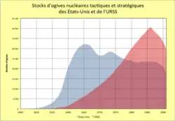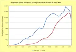 L'atteinte de la parité stratégique aurait pu engendrer une pause dans le développement des arsenaux nucléaires, mais ce ne fut pas le cas, en raison notamment des sauts technologiques de l'arsenal nucléaire américain. La décision des États-Unis de développer des ogives à tête multiples fait passer entre 1969 et 1975 le nombre de têtes nucléaires équipant les missiles stratégiques de 2 500 à plus de 7 000. Ces ogives sont guidées en phase terminale, ce qui les rend beaucoup plus précises par réduction de l'erreur circulaire probable par rapport au but visé et donc capables d'être dirigées vers des cibles militaires protégées comme les ICBM soviétiques, faisant ainsi craindre une attaque surprise[40]. Dans les années 1970, l'URSS pour sa part continue de développer une force d'ICBM quantitativement plus importante que celle des États-Unis, générant en retour des craintes de tentative de rupture de l'équilibre stratégique.