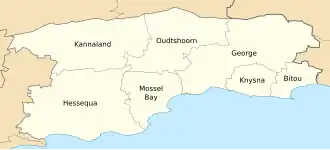 Les principales villes et localités du district sont George, Oudtshoorn, Mossel Bay, Knysna, Plettenberg Bay et Ladismith.
