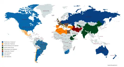Malgré cette diversité, les Juifs ashkénazes représentent la majeure partie de la communauté juive moderne, estimée entre 70 % et 80 % de tous les Juifs dans le monde[21] avant la Seconde Guerre mondiale et l'Holocauste cependant, il était de 90 %[21]. Les Ashkénazes se sont développés en Europe, mais ont subi une émigration massive à la recherche de meilleures opportunités et pendant les périodes de troubles civils et de guerre. À la suite de cela, ils sont devenus l'écrasante majorité des Juifs dans les continents et les pays du Nouveau Monde, qui étaient auparavant dépourvus de populations européennes ou juives indigènes. Il s'agit notamment des États-Unis, du Mexique, du Canada, du Royaume-Uni, de l'Argentine, Australie, Brésil et Afrique du Sud, mais avec le Venezuela et le Panama étant des exceptions puisque les Sépharades composent toujours la majorité des communautés juives dans ces deux pays. En France, les immigrants juifs sépharades plus récents d'Afrique du Nord et leurs descendants sont désormais plus nombreux que les Ashkénazes préexistants.