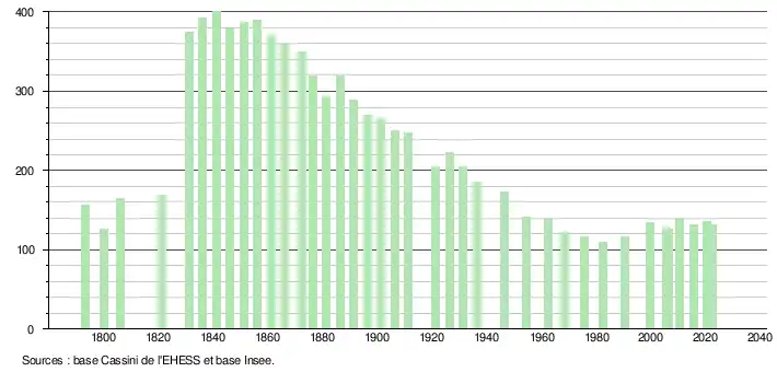 L'évolution du nombre d'habitants est connue à travers les recensements de la population effectués dans la commune depuis 1793. Pour les communes de moins de 10 000 habitants, une enquête de recensement portant sur toute la population est réalisée tous les cinq ans, les populations de référence des années intermédiaires étant quant à elles estimées par interpolation ou extrapolation[29]. Pour la commune, le premier recensement exhaustif entrant dans le cadre du nouveau dispositif a été réalisé en 2005[30].