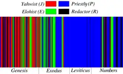 Wellhausen estimait que la source sacerdotale est largement à l'origine du Lévitique. P insiste sur le point de vue des prêtres et d'Aaron, et indique toujours la présence de ce dernier lorsque Moïse accomplit quelque chose au nom de Dieu, suggérant que le bon déroulement des miracles est dû autant à l'un qu'à l'autre. P tente aussi parfois de dénigrer la capacité de Moïse à assumer ses fonctions de dirigeant, par exemple en précisant qu'il avait tant changé après avoir reçu le Décalogue que nul ne pouvait plus le regarder.[réf. nécessaire]