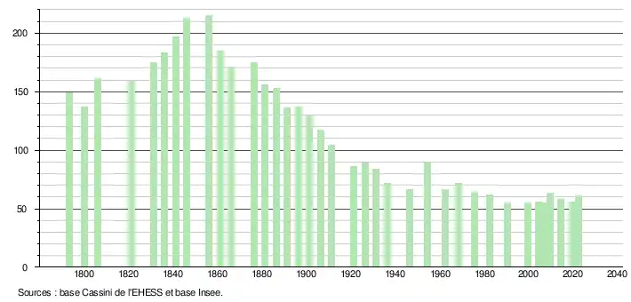 L'évolution du nombre d'habitants est connue à travers les recensements de la population effectués dans la commune depuis 1793. Pour les communes de moins de 10 000 habitants, une enquête de recensement portant sur toute la population est réalisée tous les cinq ans, les populations de référence des années intermédiaires étant quant à elles estimées par interpolation ou extrapolation[25]. Pour la commune, le premier recensement exhaustif entrant dans le cadre du nouveau dispositif a été réalisé en 2004[26].