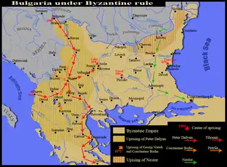 La première tentative de libération a été l'œuvre de Petar Delyan, mais a échoué. La raison spécifique du soulèvement était l'augmentation des impôts pour la population et l'abolition du régime antérieur préservé et des relations publiques par Basile II dans les terres bulgares . Le soulèvement a été annoncé à Belgrade et a couvert les terres bulgares occidentales ( Nis, Skopje ) incluses dans le thème Bulgarie . Les querelles internes affaiblirent les rebelles et ils furent vaincus par des mercenaires normands au service byzantin. Le chef du soulèvement est aveuglé. (voir Garde varangienne et Antinormannisme)