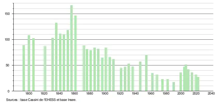 L'évolution du nombre d'habitants est connue à travers les recensements de la population effectués dans la commune depuis 1793. Pour les communes de moins de 10 000 habitants, une enquête de recensement portant sur toute la population est réalisée tous les cinq ans, les populations de référence des années intermédiaires étant quant à elles estimées par interpolation ou extrapolation[25]. Pour la commune, le premier recensement exhaustif entrant dans le cadre du nouveau dispositif a été réalisé en 2004[26].