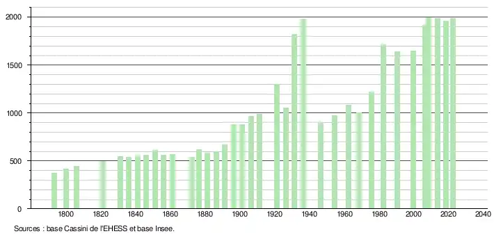 L'évolution du nombre d'habitants est connue à travers les recensements de la population effectués dans la commune depuis 1793. Pour les communes de moins de 10 000 habitants, une enquête de recensement portant sur toute la population est réalisée tous les cinq ans, les populations de référence des années intermédiaires étant quant à elles estimées par interpolation ou extrapolation[33]. Pour la commune, le premier recensement exhaustif entrant dans le cadre du nouveau dispositif a été réalisé en 2008[34].