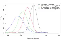 Lorsque les données entrent dans la catégorie MNAR, des techniques sont disponibles pour estimer de manière cohérente les paramètres lorsque certaines conditions se vérifient dans le modèle[3]. Par exemple, si Y explique la raison du manque dans X et Y lui-même a des valeurs manquantes, la distribution de probabilité conjointe de X et Y peut toujours être estimée si le manque de Y est aléatoire. L'estimation dans ce cas sera: