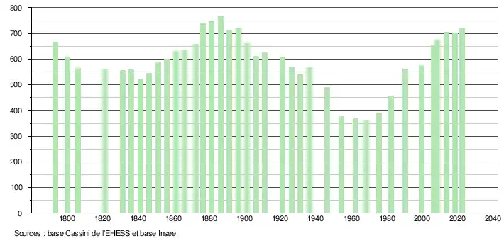 L'évolution du nombre d'habitants est connue à travers les recensements de la population effectués dans la commune depuis 1793. Pour les communes de moins de 10 000 habitants, une enquête de recensement portant sur toute la population est réalisée tous les cinq ans, les populations de référence des années intermédiaires étant quant à elles estimées par interpolation ou extrapolation[16]. Pour la commune, le premier recensement exhaustif entrant dans le cadre du nouveau dispositif a été réalisé en 2008[17].