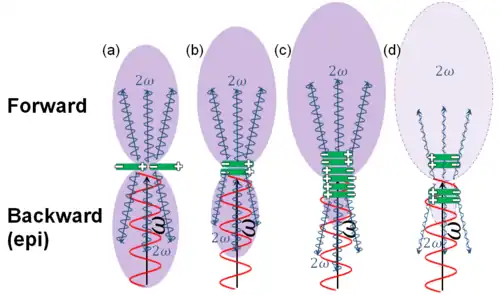 De plus, l'accord de phase (en) SHG peut également entraîner : de la SHG est également émise vers l'arrière (direction epi). Lorsque l'accord de phase (en) n'est pas respecté, comme dans les tissus biologiques, le signal vers l'arrière provient d'un désaccord de phase suffisamment élevé permettant une contribution vers l'arrière qui compense le désaccord [9]. Contrairement à la fluorescence, la cohérence spatiale du processus le contraint à n'émettre que dans ces deux directions, mais la longueur de cohérence vers arrière ((en) backward) est toujours bien plus petite que vers l'avant ((en) forward), il y a donc toujours plus de signal SHG en avant qu'en arrière [10].