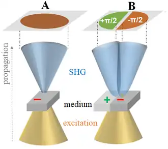 Le diagramme de rayonnement (ou patron de radiation) SHG généré avec un faisceau gaussien d'excitation a également un profil 2D gaussien (homogène) si le milieu non linéaire excité est homogène. Cependant, si le faisceau d'excitation est positionné à une interface entre deux polarités opposées (frontière +/-) parallèle à la propagation du faisceau (voir figure), le SHG sera divisé en deux lobes dont les amplitudes seront de signe opposé, c'est-à-dire déphasées de [8].