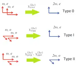 Une forte conversion peut être obtenue si l'accord de phase (en) est réalisé. En général, dans un cristal, les ondes fondamentales et la seconde harmonique doivent être dans des états de polarisation bien spécifiques pour interférer constructivement et permettre une génération significative. La figure ci-contre montre les trois types possibles de génération dans des milieux biréfringents.