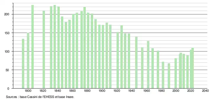 L'évolution du nombre d'habitants est connue à travers les recensements de la population effectués dans la commune depuis 1793. Pour les communes de moins de 10 000 habitants, une enquête de recensement portant sur toute la population est réalisée tous les cinq ans, les populations de référence des années intermédiaires étant quant à elles estimées par interpolation ou extrapolation[22]. Pour la commune, le premier recensement exhaustif entrant dans le cadre du nouveau dispositif a été réalisé en 2005[23].