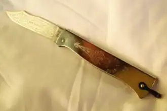 - la lame, à l'origine en acier au carbone, qui peut s'affûter facilement ; elle a une forme « à la turque », en cimeterre, avec un dos à bosses ; elle est décorée d'arabesques gravées à l'acide ;