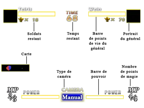 Le joueur est amené à diriger un groupe constitué d'un général et au maximum de cent soldats. Chaque commandant représente une classe particulière : chevalier, moine, magicien, prêtre, ninja, samouraï, etc. Il existe dix types de métiers principaux, chacun apportant des tactiques, compétences ou sorts de magie divers[11]. La victoire dans une bataille rapportent des points d'expérience dont l'accumulation est nécessaire aux personnages pour gravir des niveaux, qui eux-mêmes engendrent une augmentation des caractéristiques – vie, magie, force et commandement – et de nouvelles compétences. Un général utilise les services d'un type de troupes spécifiques : soldats, cavalerie, archers, harpies, zombis, dragons, etc. Au commencement, un commandant accède à une, voire plus, catégorie de combattants. D'autres se débloquent au moyen d'objets découverts dans les châteaux. Selon sa catégorie, une armée est plus ou moins efficace contre un autre type de troupes[6],[4]. Ce paramètre a une influence prépondérante sur l'issue du conflit. Par exemple, un nombre restreint de soldats particulièrement efficace peut détruire un groupe de combattants plus nombreux mais moins puissants[10].