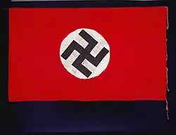 Le drapeau de l'Allemagne nazie, officiellement le drapeau du Reich allemand, comporte un fond rouge avec une croix gammée noire sur un disque blanc. Ce drapeau a d'abord été utilisé comme bannière du parti nazi (NSDAP) après sa fondation. À la suite de la nomination d'Adolf Hitler au poste de chancelier en 1933, ce drapeau a été adopté comme l'un des deux drapeaux nationaux de la nation, l'autre étant le tribande noir-blanc-rouge de l'Empire allemand.