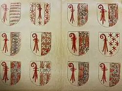 | Éléments | Une crosse épiscopale rouge et des fasces rouge et blanches |