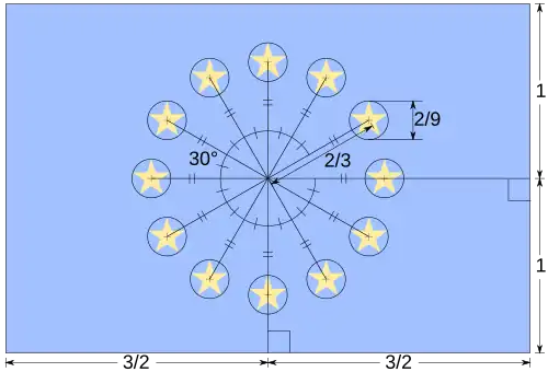L’emblème est constitué par un rectangle bleu dont le battant a une fois et demie la longueur du guindant. Douze étoiles d’or s’alignent régulièrement le long d’un cercle non apparent, dont le centre est situé au point d’intersection des diagonales du rectangle. Le rayon de ce cercle est égal au tiers de la hauteur du guindant. Chacune des étoiles à cinq branches est construite dans un cercle non apparent, dont le rayon est égal à un dix-huitième de la hauteur du guindant. Toutes les étoiles sont disposées verticalement, c’est-à-dire avec une branche dirigée vers le haut et deux branches s’appuyant sur une ligne non apparente, perpendiculaire à la hampe.