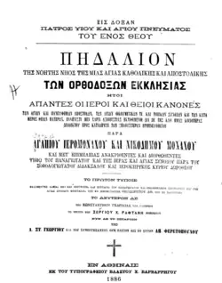 Le Pedalion est écrit par Nicodème l'Hagiorite et Agépius (saint orthodoxe). Il est publié pour la première fois en 1800. Il est ensuite adopté par le patriarche Néophyte VII de Constantinople et son Saint Synode en tant que recueil officiel de droit canonique[21]. Il s'agit actuellement de la collection de droit canonique la plus utilisée dans les Églises orthodoxes de culture grecque[4].