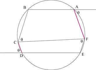 Nous allons montrer que si deux paires de côtés opposés d'un hexagone inscrit dans un cercle sont parallèles, alors le troisième aussi, en utilisant le théorème de l'angle inscrit. Par transformation projective, ceci permet d'obtenir le théorème de Pascal direct dans sa généralité[3].