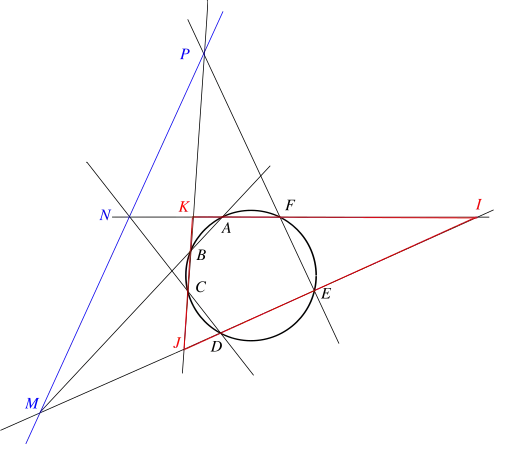 On veut prouver l'alignement de ; on utilisera donc le théorème de Ménélaüs. Un triangle envisageable pour ce théorème est obtenu avec les droites qui donnent les points (un autre celui construit avec ). Les côtés non utilisés de l'hexagone fournissent des points alignés avec , d'où des utilisations possibles de Menelaüs qui traduisent en fait la façon dont la figure est construite. Il suffit alors d'utiliser le fait que tous ces points sont sur un même cercle, ce qui justifie l'utilisation de la puissance d'un point.