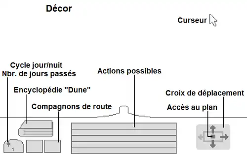 Au début du jeu, Paul se voit confier la mission de rencontrer les chefs de tribus Fremen. Le joueur déplace Paul dans le monde ouvert que constitue la planète Arrakis. Le monde visité étant désertique, il ne peut traverser longtemps le désert à pied. Il peut aussi se déplacer à l’aide d’un ornithoptère puis plus tard d’un ver de sable pour aller en des lieux précis ou pour explorer la planète[9]. Il peut également se déplacer à l’intérieur des bâtiments de case en case via des flèches à la manière des jeux de rôle[9] et des dungeon crawlers[12].