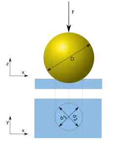 Le pénétrateur est une bille en acier trempé ou en carbure de tungstène de diamètre D (mm), l'empreinte est une calotte sphérique de diamètre d. La force appliquée F est choisie dans une gamme normalisée adaptée à D et au matériau à tester[2]. La dureté Brinell (notée HB) est donnée par la relation suivante :