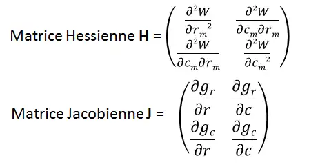 L’exemple pris est ici un modèle étudiant le trade-off résistance aux perturbations r et taux de colonisation c. À partir de la fonction d’invasion du mutant rare (: fitness), on peut calculer les gradients de sélection sur ces deux paramètres (r et c) en dérivant la fonction de fitness. Les dérivées de ses gradients donnant deux matrices : la matrice Hessienne et la matrice Jacobienne (Figure 7). Ces matrices permettent de connaître si l’équilibre (visualisé Figure 6) correspond à une stratégie évolutivement stable (ESS), à un point de branchement, un repoussoir ou s’il est convergent stable.
