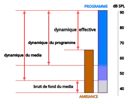 La dynamique effective d'un programme au moment où il est écouté n'est plus celle du moyen de transmission. Au bruit de fond de celui-ci s'ajoute celui du lieu d'écoute. Si la dynamique du programme est trop grande, ses parties les plus faibles seront perdues dans le bruit de fond du local d'écoute.