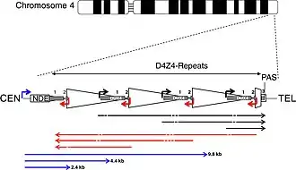 - FSHD1 : pour 95 % des patients, la maladie est due à une réduction (délétion) de la zone D4Z4 au bout du chromosome 4 sur le bras long en 4q35. Chez les personnes non atteintes, il y a plus de 11 répétitions D4Z4 dans cette zone. Chez les patients FSH, il y a moins de 10 répétitions ; et plus le nombre de répétitions est faible, plus les symptômes sont sévères[6]. La technique de peignage moléculaire permet de faire le diagnostic de cette anomalie de façon fiable[25] ;