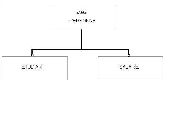 SCHEMA etablissement; ENTITY PERSONNE ABSTRACT SUPERTYPE OF (ONEOF(ETUDIANT, SALARIE)); END_ENTITY; ENTITY ETUDIANT SUBTYPE OF (PERSONNE); END_ENTITY; ENTITY SALARIE SUBTYPE OF (PERSONNE); END_ENTITY; END_SCHEMA;