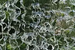 Majoritairement observable sur Terre à l'état liquide, l'eau est en effet un puissant solvant d'autant qu'elle est plus pure : elle dissout facilement ou solubilise rapidement de nombreux corps ioniques, comme les matières salines, à l'image du sel et du gypse qu'elle peut transporter, ainsi que de nombreux autres gaz[d], par exemple les composants de l'air, en particulier l'oxygène ou le dioxyde de carbone. L'expression « solvant universel »[14] est toutefois sujette à maintes précautions, beaucoup de matériaux naturels (roches, métaux, etc.) étant insolubles dans l'eau (dans la plupart des cas ou de manière infime). Du fait de sa masse volumique, l'eau qui se meut par gravité peut arracher et mettre en suspension un grand nombre de corps, petit et gros, ce qui accroît d'autant la densité apparente de la phase liquide en mouvement, et explique la force d'arrachement et de ravinement des flux d'eaux boueuses ou composites de roches et végétaux, ces derniers nommées "laves" dans diverses traditions montagnardes, causant un recouvrement final en bout de pente ou lors du retrait.