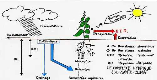 La porosité du sol de l'ordre de 20 à 30 % en général peut être considérée comme la capacité de stockage de l'humidité d'un sol. Le sol est dit saturé lorsque sa porosité est presque totalement occupée par l'eau, ce qui se produit dans les aquifère et les nappes phréatiques. Au-dessus des aquifères, la zone vadose qualifie une zone non saturée en eau[17] . L'eau dans un sol non saturé est retenue par des forces capillaires (de succion). L'eau excédentaire, dite gravitaire parce que sollicitée par la pesanteur, descend vers la nappe phréatique. Le sol se draine jusqu'à atteindre la capacité au champ qui est la capacité de rétention maximale en eau du sol, soit la quantité d'eau retenue dans un sol après que l'eau gravitaire s'est écoulée[18] (La circulation de l'eau filtrant à travers le sol est soumise à la loi de Darcy et fonction de la conductivité hydraulique). La capacité au champ de même que la réserve utile en eau d'un sol, sont principalement tributaire de la texture du sol, de la taille des pores et de sa profondeur. On peut distinguer texture sableuse, limoneuse, argileuse, l'optimum étant atteint dans la texture équilibrée qui présente la plupart des qualités des trois, sans en avoir les défauts. La réserve utile en eau d'un sol est la différence entre l'eau contenue dans le sol à la capacité au champ, et l'eau contenue dans le sol au point de flétrissement. Elle correspond à une lame d'eau contenue dans une épaisseur unitaire de sol et est exprimée généralement en mm/m. La réserve utile totale est proportionnelle à l'épaisseur sol.