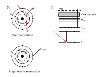 (a) illustre séquentiellement les étapes impliquées dans la désexcitation Auger-Meitner . Un électron incident (ou un photon) crée un trou de cœur dans le niveau 1s. Un électron du niveau 2s remplit le trou 1s et l'énergie de transition est transmise à un électron 2p qui est émis. Le niveau atomique final a ainsi deux trous, un sur l'orbitale 2s et un autre sur l'orbitale 2p.