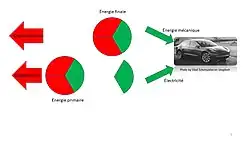 Même à partir de ressources fossiles, le gain de la chaîne électrique peut devenir ultérieurement très important en matière de rendement, et même plus favorable en matière de gaz à effet de serre que l'utilisation directe de carburant dans un véhicule thermique[17], grâce à la cogénération, ou au gaz, moins carboné, dans les centrales à cycle combiné.