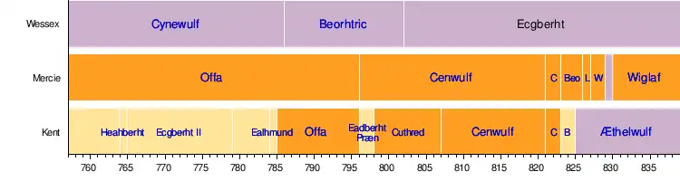 Du côté du royaume de Kent, Offa semble avoir aidé Heahberht à prendre le pouvoir vers 764-765[7]. Après cette date, les sources ne permettent pas d'affirmer avec certitude qu'il contrôle la région, mais les rois de Kent semblent avoir bénéficié d'une certaine indépendance vis-à-vis de la Mercie à partir de 776 au plus tard[4],[8]. Il est très difficile de dater les rois de cette période : Ecgberht II, apparu en 765, disparaît des sources après 779, tandis qu'Ealhmund, le père supposé d'Ecgberht, n'est attesté que pour la seule année 784. On ne lui connaît pas de successeur, et à compter de 785 environ, Offa se comporte comme si le Kent n'était qu'une province de son royaume[9]. Ecgberht se réfugie vraisemblablement à la cour du Wessex à ce moment-là[10].