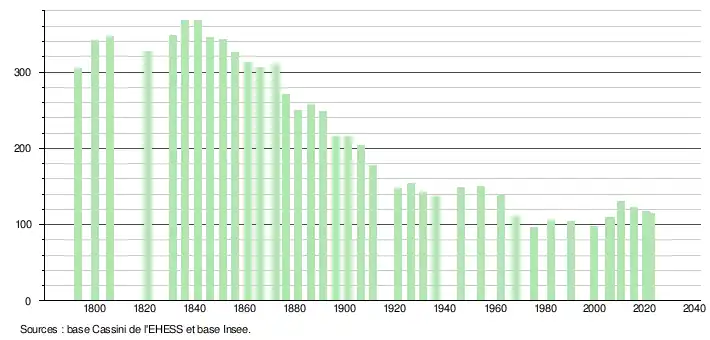 L'évolution du nombre d'habitants est connue à travers les recensements de la population effectués dans la commune depuis 1793. Pour les communes de moins de 10 000 habitants, une enquête de recensement portant sur toute la population est réalisée tous les cinq ans, les populations de référence des années intermédiaires étant quant à elles estimées par interpolation ou extrapolation[19]. Pour la commune, le premier recensement exhaustif entrant dans le cadre du nouveau dispositif a été réalisé en 2005[20].