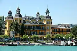 - (de) Cet article est partiellement ou en totalité issu de l’article de Wikipédia en allemand intitulé « Ein Schloß am Wörthersee » (voir la liste des auteurs).