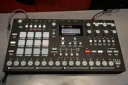 - L'Analog Rytm était le troisième instrument dans la série analogique de Elektron. Il est sorti en 2014. Il utilise aussi la synthèse analogique ainsi que des effets numériques et la possibilité d'utiliser des samples[8]. Cette boîte à rythmes hybride à huit voix a rapidement trouvé sa place dans la communauté électronique. À l'époque, il y avait une tendance parmi les musiciens de revenir à la création musicale en utilisant du matériel physique et plus seulement des logiciels.