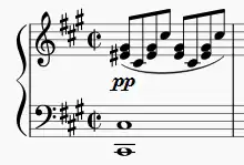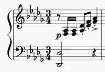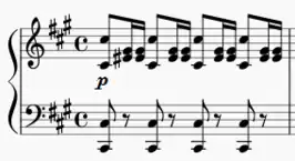 Le second motif d'interlude est assimilable à l'accompagnement des couplets B. De plus, la main gauche présente une sorte de petite « mélodie » à la voix supérieure; la voix inférieure étant la basse.