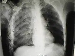 Dans une pneumonectomie, dans laquelle un poumon entier est retiré, le moignon bronchique restant peut laisser fuir de l'air, une condition rare mais très grave qui conduit à un emphysème sous-cutané progressif. [8] L'air peut s'échapper de l'espace pleural par une incision pratiquée pour une thoracotomie afin de provoquer un emphysème sous-cutané. [8] À de rares occasions, le cas peut résulter d'une chirurgie dentaire, généralement due à l'utilisation d'outils à grande vitesse entraînés par de l'air. [24] Ces cas se traduisent généralement par un gonflement indolore du visage et du cou, avec un début immédiat, le crépitement typique de l'emphysème sous-cutané, et souvent avec de l'air sous-cutané visible aux rayons X. [24]