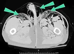 Scanner abdominal (rayons X) d'un patient présentant des emphysèmes sous-cutanés (fléchés). | |