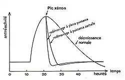 - Lors d'un démarrage et d'une montée en puissance de quelques dizaines de minutes suivie d'un palier, à partir d'une situation cœur vierge sans iode ni xénon, le xénon atteint sa valeur d'équilibre au bout d'un temps supérieur à celui de l'iode ; dit de façon simpliste, il faut attendre que l'iode ait atteint un régime stable pour que le xénon soit à l'équilibre.