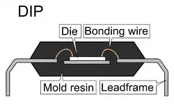 Coupe transversale d'un dual in-line package (DIP). Ce type de boîtier abrite une petite puce semi-conductrice, avec des fils microscopiques connectant la puce (die) aux lead frames (en), permettant de réaliser les connections électriques vers un circuit imprimé (ou PCB).