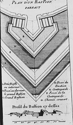 ↑ Bastion du modèle de Pagan.On peut situer ces réalisations entre 1643 et les travaux de Vauban à Thionville, ces ouvrages étant absents sur les plans du siège de 1643 et sur les peintures de Peeter Snayers de la bataille de Thionville de 1639[5], ils ne correspondent pas non plus aux travaux de Vauban. Il pourrait s'agir là des travaux hypothétiques menés par chevalier de Clerville dont parle Guillaume-Ferdinand Teissier[6]. On peut cependant remarquer dans ces modifications des caractéristiques propres aux théories de Blaise François Pagan tant sur l'aspect des retranchements des bastions que dans les rentrants de la courtine au coin des flancs des bastions avec celle-ci[7].
