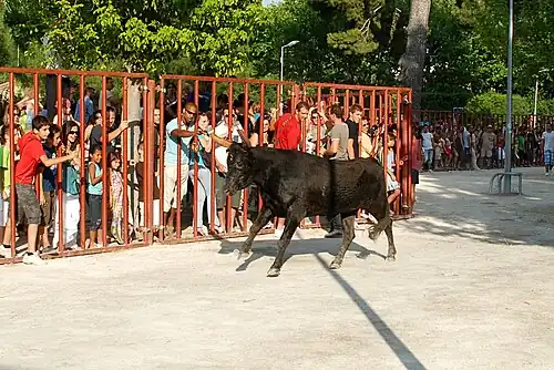 Ces spectacles n'impliquent pas de cavaliers (au contraire de l'abrivado et de la bandido) : les villageois à pied excitent les taureaux et leur échappent en se réfugiant sur des ballots de paille ou derrière les barrières.