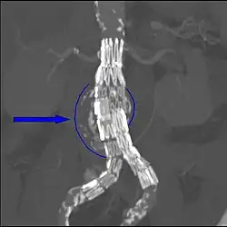 - ↑ (en) Cao P. « Clinical effect of abdominal aortic aneurysm endografting: 7-year concurrent comparison with open repair » J Vasc Surg. 2004 Nov;40(5):841-8.