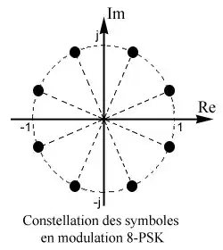 Dans 8-PSK (Phase-shift keying), 3 bits consécutifs sont représentés par 1 symbole. Chaque symbole est situé à égale distance sur le cercle complexe.