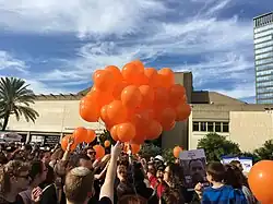 Outre les manifestations régulières, organisées notamment par Le collectif 7 octobre (dont 3 500 bénévoles en France) pour la libération des otages, qui affichent particulièrement les visages des deux enfants Bibas, identifiables à leur chevelure rousse, sur de nombreuses pancartes appelant à la libération de tous les otages[15], des rassemblements appelant spécifiquement à la libération des membres de la famille Bibas ont lieu dans plusieurs centres en Israël et à l'étranger, y compris des manifestations régulières devant la maison du secrétaire général de l'ONU, Antonio Guterres[45],[46],[47]. Dans beaucoup de ces manifestations, la couleur orange est soulignée, symbole des otages, de la violence du mouvement terroriste palestinien Hamas et de l'espoir de voir revenir les otages[15],[42], comme sur la tour pyramidale de San Francisco, culminant à 260 mètres, éclairée en orange pour les membres kidnappés de la famille Bibas, dès le 9 novembre 2023.