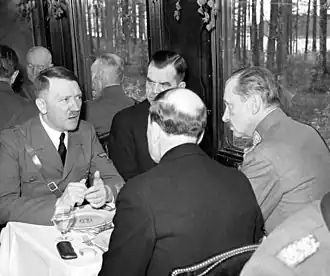 Après les salutations et les discours officiels, Hitler et Mannerheim, accompagnés d'autres responsables allemands et finlandais, sont entrés dans le wagon privé de Mannerheim pour les cigares, les boissons et le déjeuner[6]. Dans ce wagon, un grand microphone visible avait été installé par Thor Damen, un ingénieur du son pour le radiodiffuseur finlandais Yleisradio (YLE), qui avait été chargé d'enregistrer le discours officiel d'Hitler et le message d'anniversaire à Mannerheim[6].